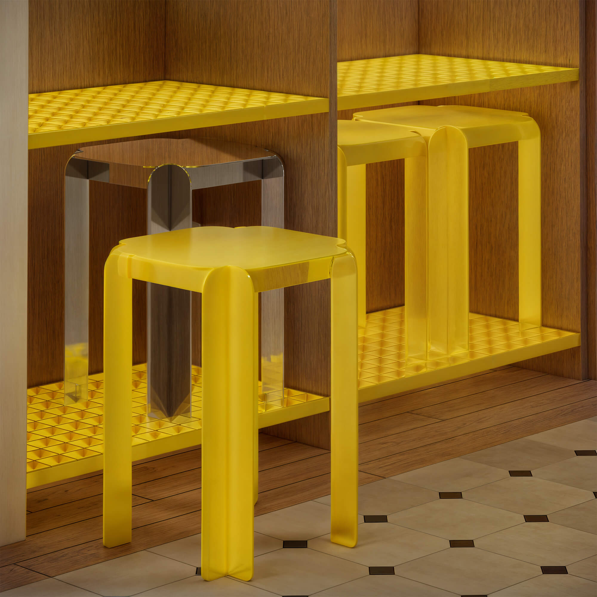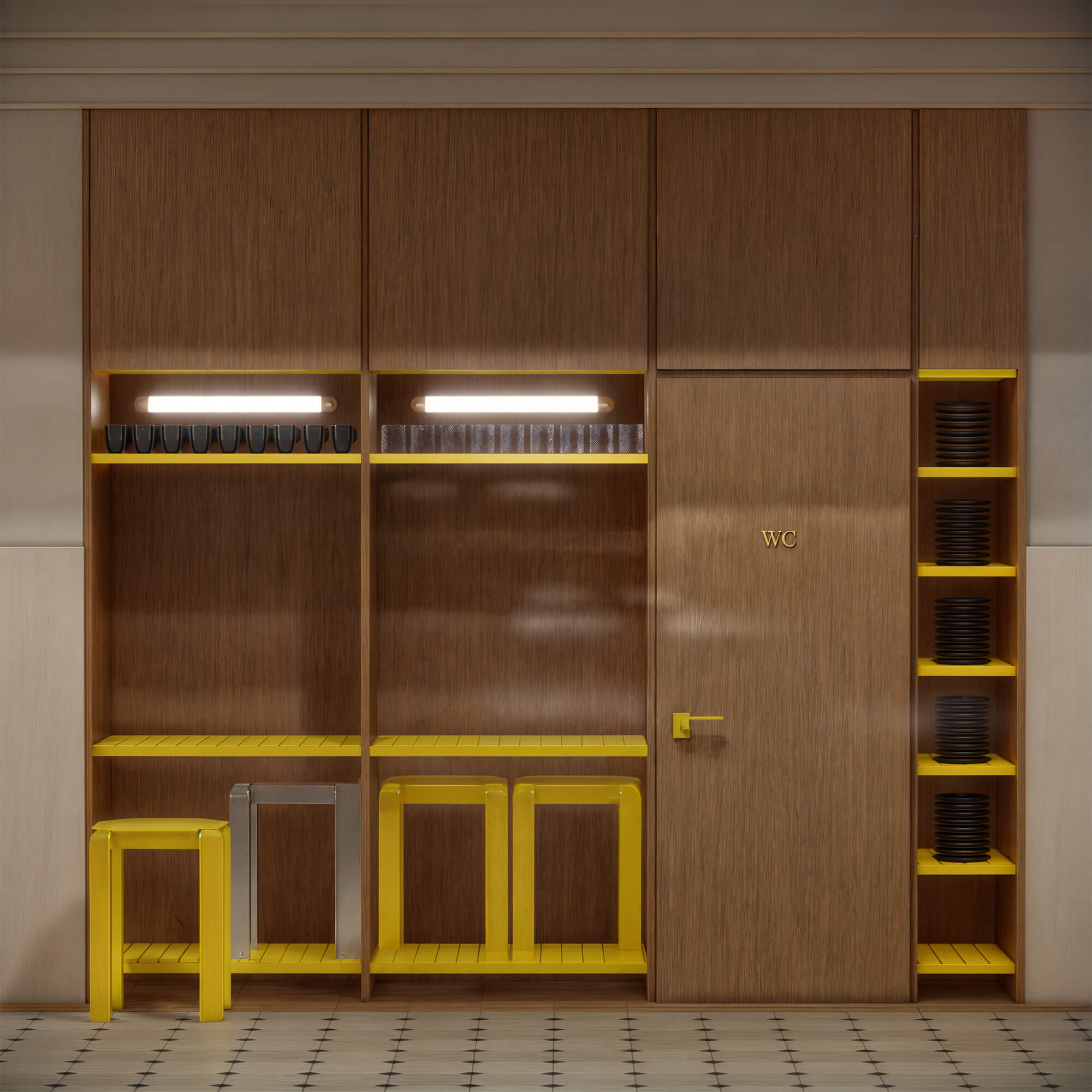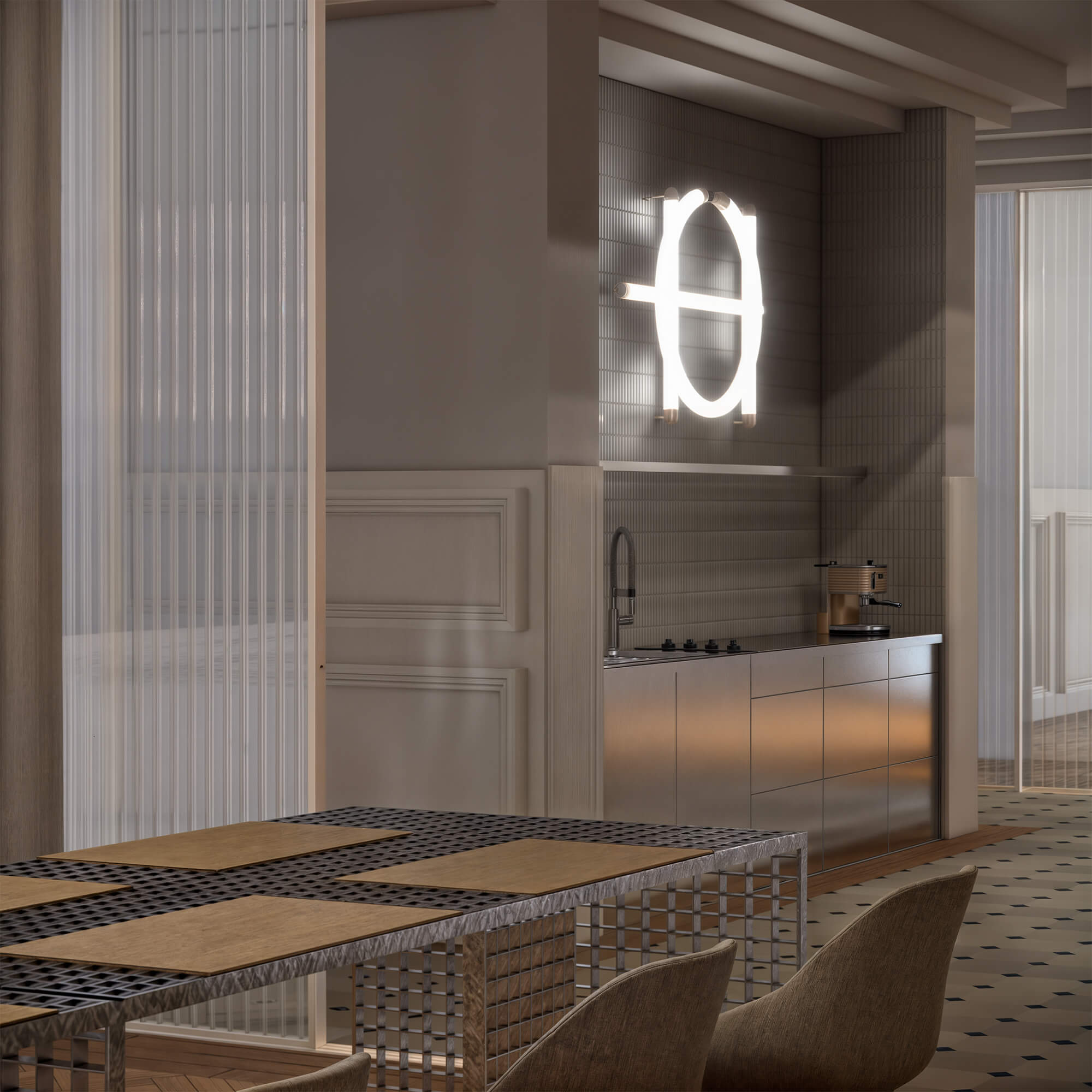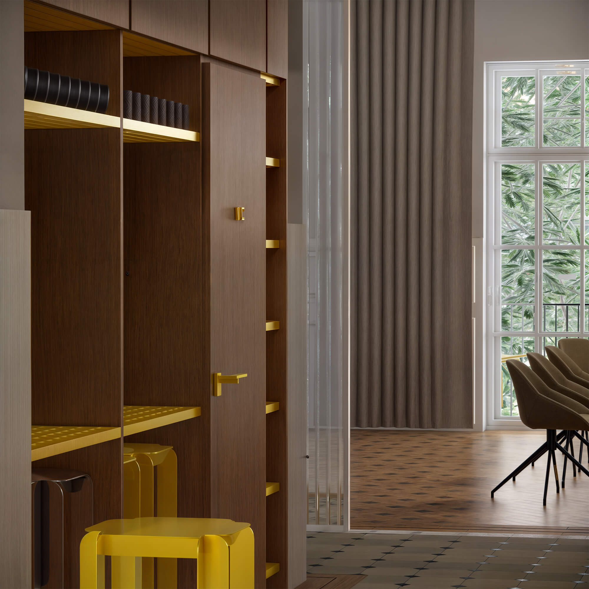 Das Design spielt mit Kontrasten: Kühle Edelstahl-Oberflächen in der Küchenzeile treffen auf warme Holzelemente und strukturierte Stoffe, während das leuchtend gelbe Gitter-Schreibtischdesign dem Raum eine dynamische Note verleiht. Transparente und halbtransparente Wände sorgen für eine offene, lichtdurchflutete Umgebung, die Kommunikation und Konzentration gleichermaßen fördert. Ein maßgeschneidertes Konzept, das nicht nur den Anforderungen eines modernen Immobilienbüros gerecht wird, sondern auch ein visuelles Statement setzt.
